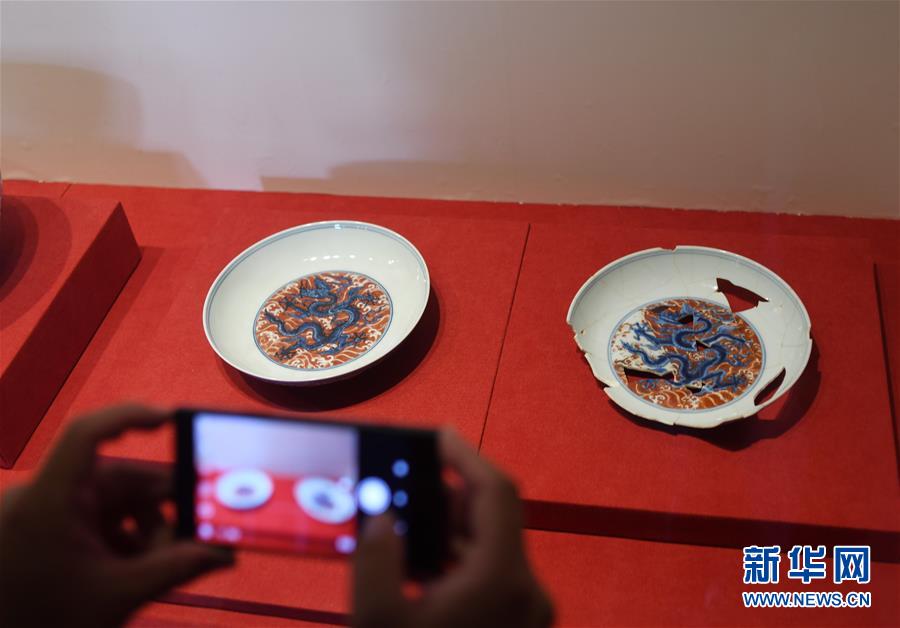 9月21日,参会嘉宾拍摄青花加矾红彩海水龙纹盘,左为故宫院藏,右为景德镇出土修复件。新华社记者 金良快 摄