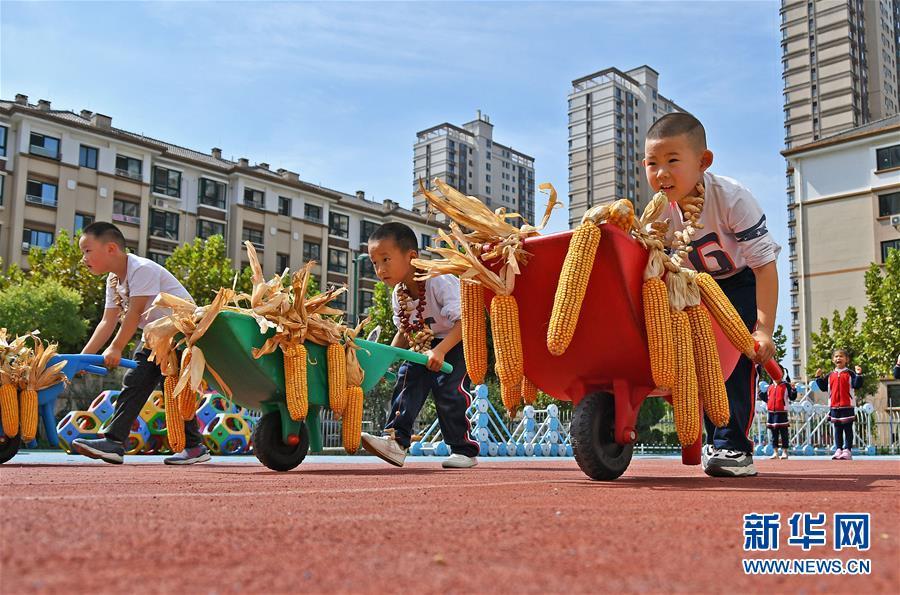 9月21日,山东省烟台市福山区清洋街道中心幼儿园的小朋友进行“运送粮食”趣味比赛。 9月22日是第三个中国农民丰收节,多地举办形式多样的活动迎接丰收节。 新华社发(孙文潭 摄)