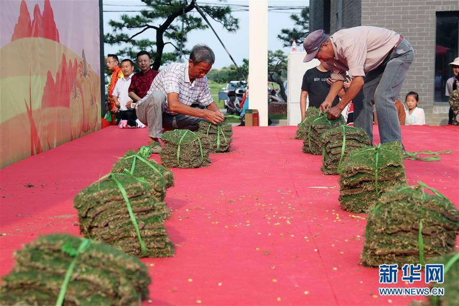 9月20日,江苏省如皋市如城街道钱长村村民在趣味农事大比拼活动中进行“扎草捆”。 9月22日是第三个中国农民丰收节,多地举办形式多样的活动迎接丰收节。 新华社发(许丛军 摄)
