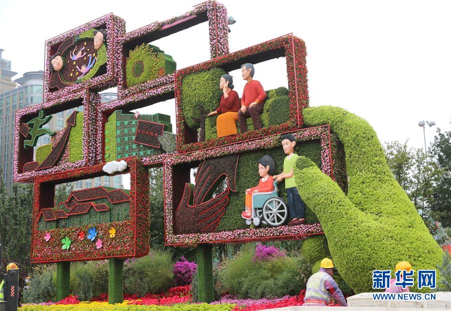 9月23日,工人在布置位于东单的一处花坛。 国庆节将至,北京街头的主题花坛布置工作正紧锣密鼓地进行。 新华社发(梁志强 摄)