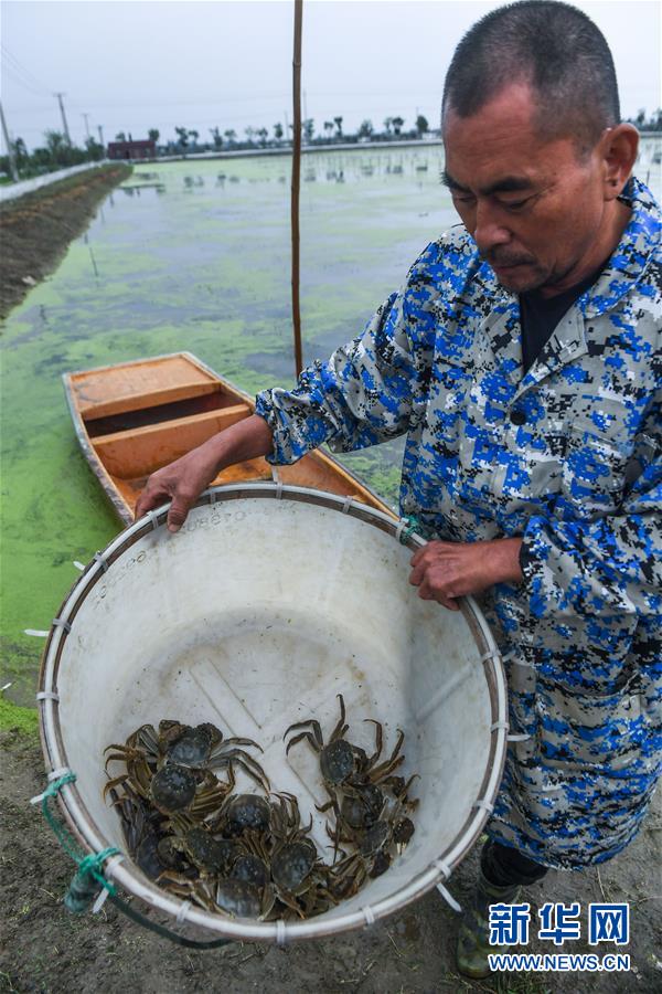 9月23日,在杨溇村“杨桂珍”太湖蟹养殖基地,养殖户展示刚刚收获的太湖蟹。新华社记者 徐昱 摄
