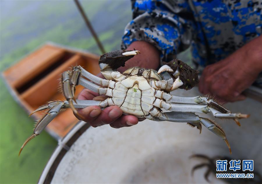 9月23日,在杨溇村“杨桂珍”太湖蟹养殖基地,养殖户展示刚刚收获的太湖蟹。新华社记者 徐昱 摄