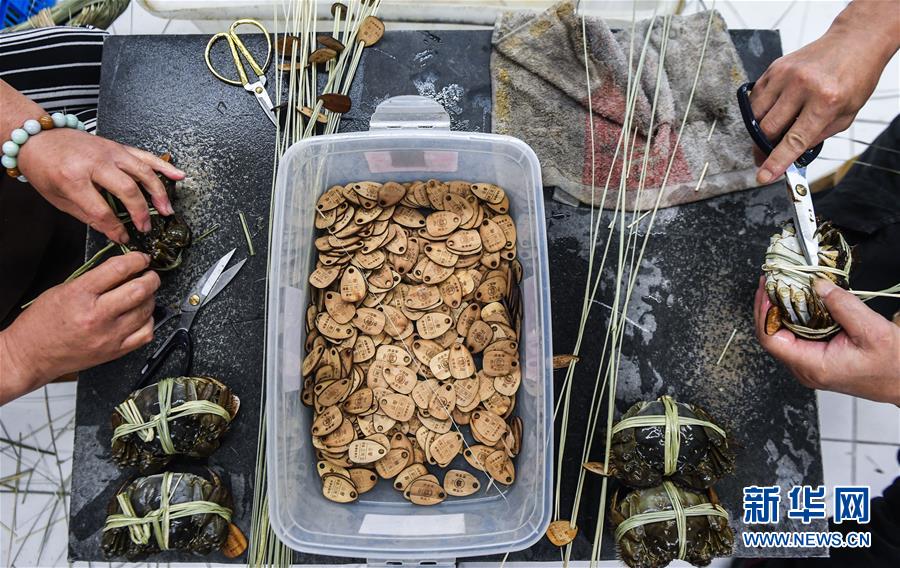 9月23日,在杨溇村“杨桂珍”太湖蟹养殖基地,养殖户用马莲草捆扎收获的太湖蟹,并根据蟹的不同重量挂上相应的防伪标志牌。新华社记者 徐昱 摄