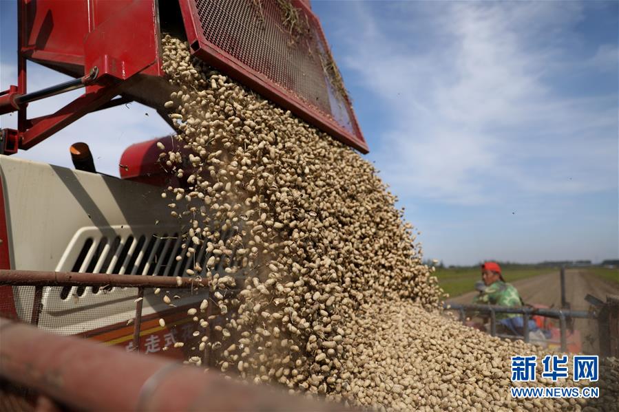 9月23日,在台安县桑林镇大友村,收割摘果后的花生被倒入运输车辆。 目前正值辽宁省鞍山市台安县花生大面积收获的季节,广大农民抢抓农时,运用农业机械适时收获,田间地头一派繁忙景象。 新华社记者 姚剑锋 摄