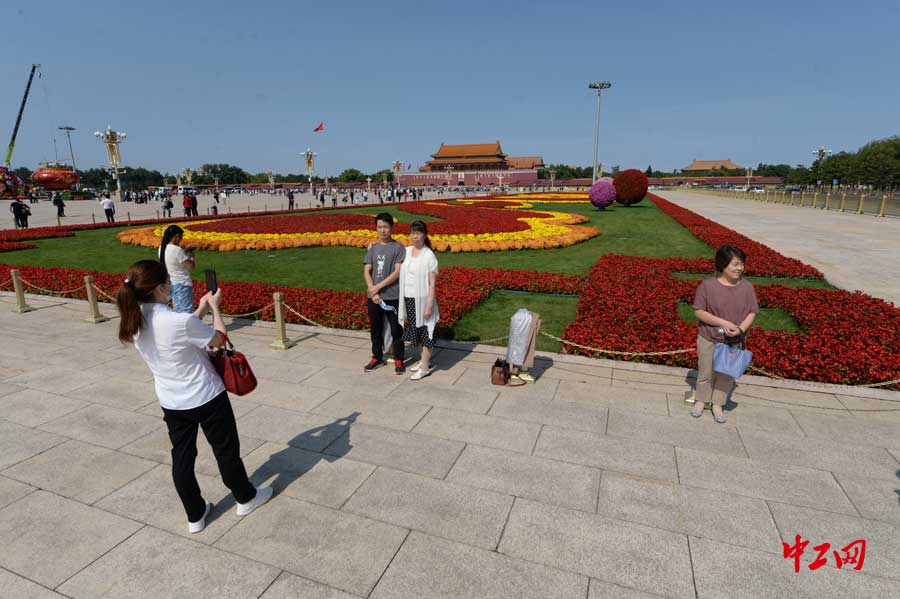 9月22日,游客们在天安门广场东侧的花坛前留影。工人日报—中工网记者 吴凡 摄
