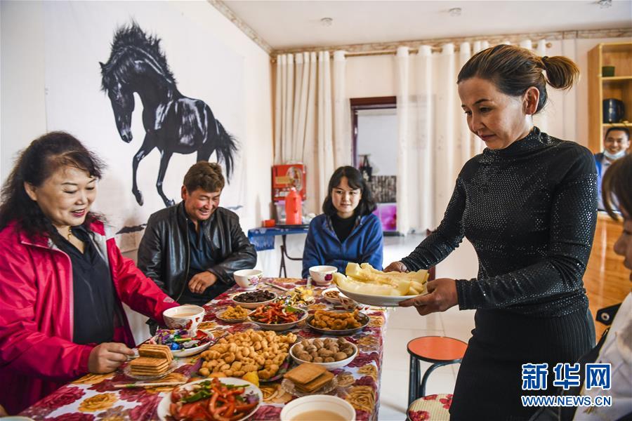 在新疆特克斯县也什克勒克村,一家牧家乐的女主人在招待客人(6月29日摄)。 天山深处,许多牧民世世代代迁徙游牧,居无定所,生活贫困。随着当地脱贫攻坚事业的推进,集中放牧、现代化养殖、外出务工……牧民逐步实现多元化就业,天山深处的村庄迎来绚丽彩虹。 新华社记者 王菲 摄