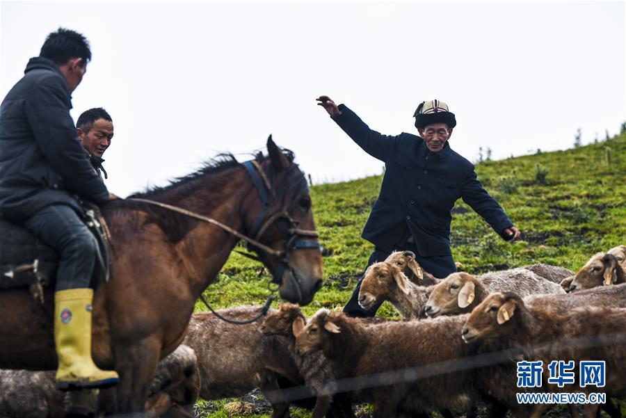 在新疆特克斯县也什克勒克村境内的夏牧场里,牧民达山·哈依达尔(右)和儿子们帮村民代牧(7月1日摄)。 天山深处,许多牧民世世代代迁徙游牧,居无定所,生活贫困。随着当地脱贫攻坚事业的推进,集中放牧、现代化养殖、外出务工……牧民逐步实现多元化就业,天山深处的村庄迎来绚丽彩虹。 新华社记者 王菲 摄