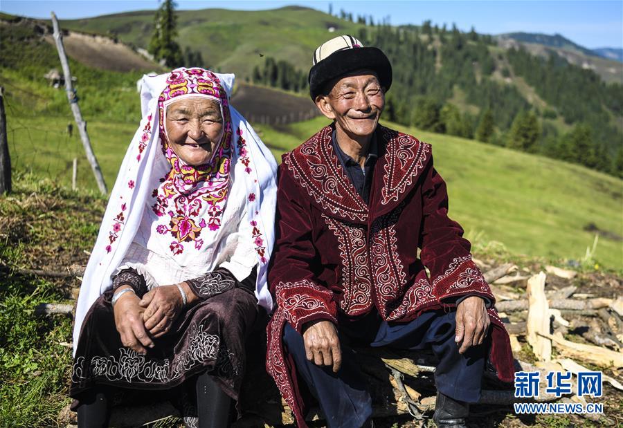 在新疆特克斯县也什克勒克村境内的夏牧场里,牧民达山·哈依达尔(右)和老伴在一起(7月2日摄)。 天山深处,许多牧民世世代代迁徙游牧,居无定所,生活贫困。随着当地脱贫攻坚事业的推进,集中放牧、现代化养殖、外出务工……牧民逐步实现多元化就业,天山深处的村庄迎来绚丽彩虹。 新华社记者 王菲 摄