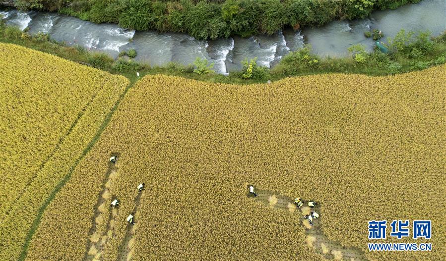 9月24日,贵州省毕节市黔西县洪水镇解放村村民抢收稻谷(无人机照片)。 金秋时节,贵州省毕节市黔西县水稻进入收获季,村民抢收水稻的同时也捕捞稻田鱼。近年来,黔西县大力推广水稻种植良种良法,提升水稻产量和品质,并引导农民科学配套发展稻田养鱼、养虾、养蛙等生态立体农业产业,有效改善土壤生态,助农增产增收。 新华社发(史开心 摄)
