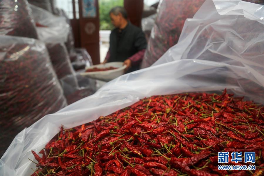 9月27日,在贵州省遵义市播州区新民镇龙丰村,椒农张吉国将辣椒装袋。 近年来,贵州省遵义市播州区积极推进辣椒农业产业化,通过引进多家辣椒加工企业,建成辣椒深加工流水线,生产火锅底料、辣椒调味品等产品。目前,全区种植辣椒近40万亩,带动8000余户贫困户近3万人增收。 新华社发(程洪凯 摄)