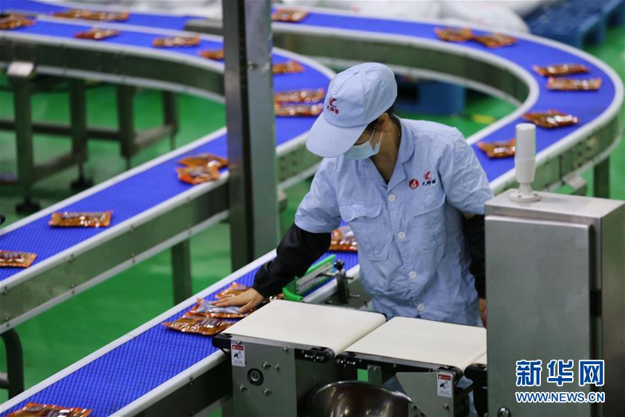 9月27日,工人在贵州省遵义市播州区石板镇一辣椒产业园生产车间工作。 近年来,贵州省遵义市播州区积极推进辣椒农业产业化,通过引进多家辣椒加工企业,建成辣椒深加工流水线,生产火锅底料、辣椒调味品等产品。目前,全区种植辣椒近40万亩,带动8000余户贫困户近3万人增收。 新华社发(杨晓海 摄)