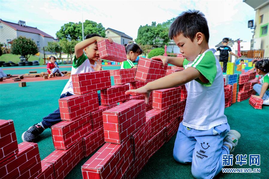 当日,浙江省湖州市长兴县李家巷镇中心幼儿园开展“巧手童心迎国庆”主题庆祝活动,幼儿园的老师和孩子们通过一起搭建纸盒万里长城、制作国庆手工蛋糕画、国庆烟花画等系列活动向祖国生日献礼。新华社记者 徐昱 摄