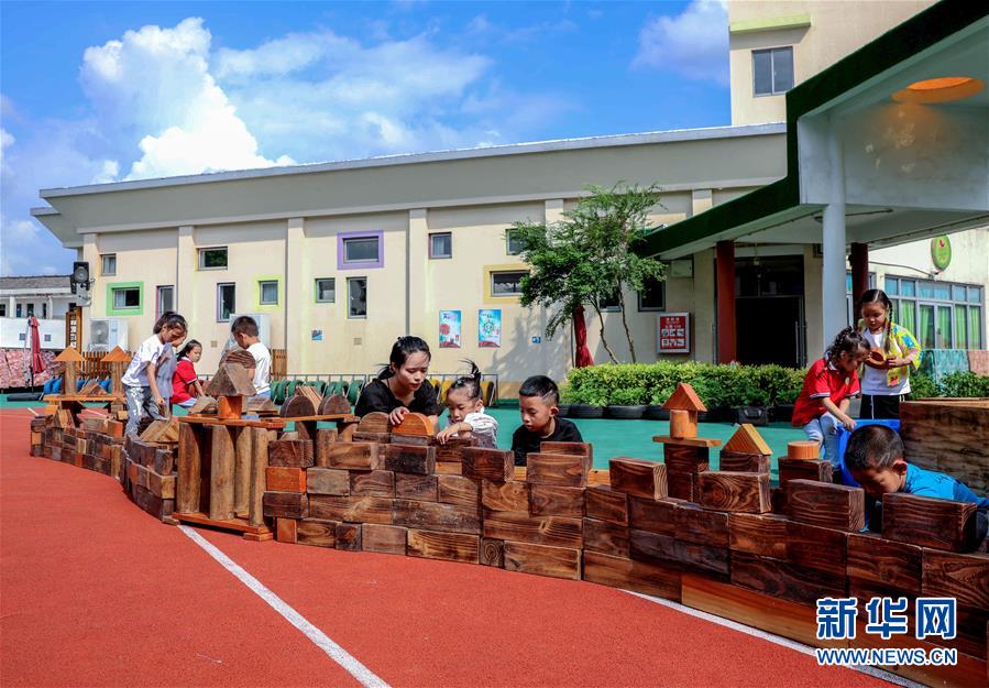 9月28日,老师和孩子们在搭建“万里长城”。新华社记者 徐昱 摄