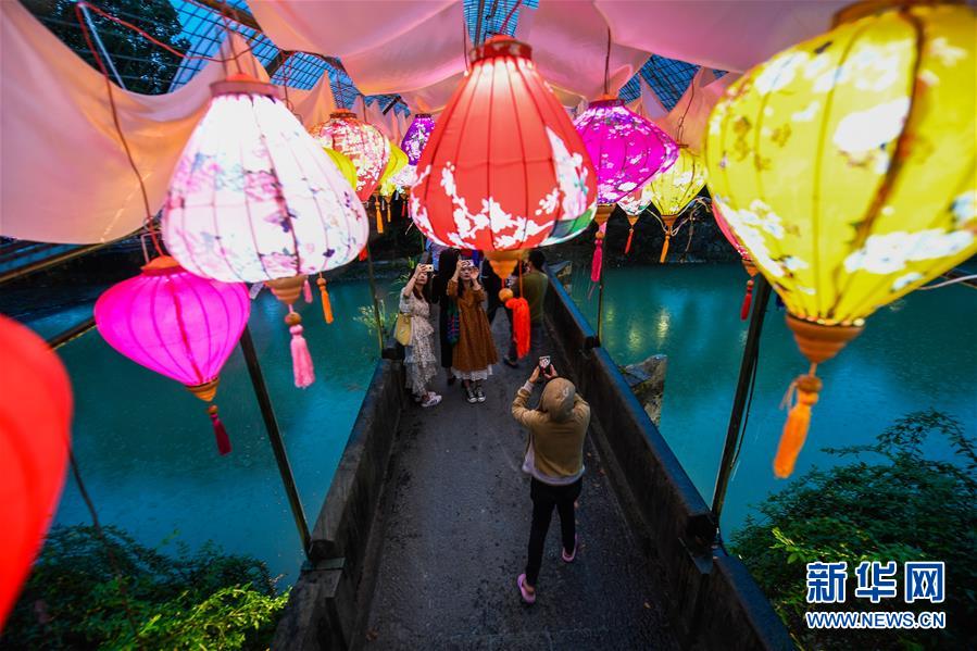 9月29日,游客在龙门古镇内观赏庙会花灯。 当日,浙江省杭州市富阳区龙门镇以“龙门古镇,喊你回家”为主题的金秋庙会正式开启。庙会结合当地旅游、文化资源,举办赏灯猜谜闹中秋、民间舞蹈展演、特色民俗展示等系列活动。 新华社记者 徐昱 摄