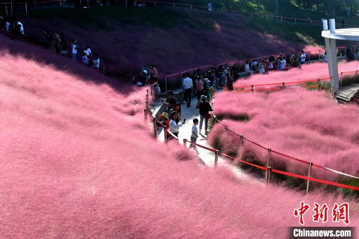 图为福州牛冈山公园粉黛乱子草花海吸引游客“打卡”。 吕明 摄
