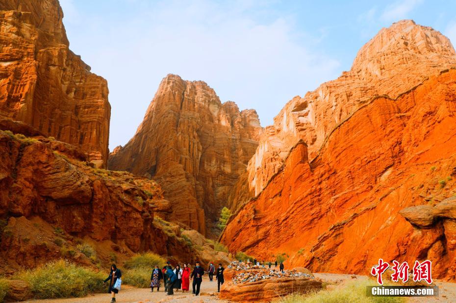 金秋时节,新疆库车大峡谷神奇独特的景观吸引着各方游客,让人流连忘返。库车大峡谷被称为中国最美的十大峡谷之一,位于天山南麓库车县阿艾乡,由红褐色的巨大山体群组成。 杨厚伟 摄