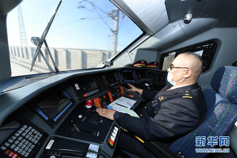 10月11日,首发动车的列车司机阿地·吐尔地在驾驶室内。 当日,新疆乌鲁木齐至陕西西安方向首趟直达动车开行,全程2354公里,运行时间13小时22分。据介绍,这是兰新高铁运营6年来开行的第二趟出疆方向动车组列车,乌鲁木齐至西安实现了朝发夕至。 新华社记者 沙达提 摄