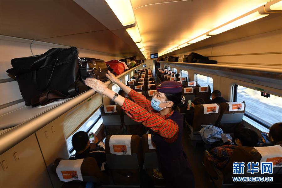10月11日,列车员在乌鲁木齐至西安北D2708次动车组列车上整理行李架。 当日,新疆乌鲁木齐至陕西西安方向首趟直达动车开行,全程2354公里,运行时间13小时22分。据介绍,这是兰新高铁运营6年来开行的第二趟出疆方向动车组列车,乌鲁木齐至西安实现了朝发夕至。 新华社记者 沙达提 摄