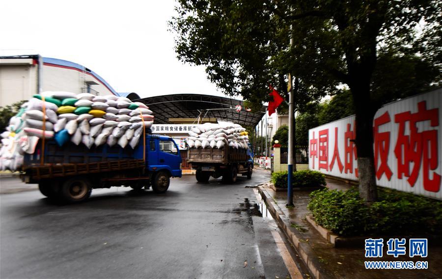 10月16日,衡阳县及周边县乡农民向灵瑞寺国家粮食储备库新库区送粮。 当日是“世界粮食日”,湖南省衡阳市衡阳县灵瑞寺国家粮食储备库新库区的工作人员冒雨为衡阳县及周边县乡农民收粮,在严格检测的基础上,将优质稻谷存入库区。衡阳县是湖南粮食主产县,常年粮食播种面积在150万亩以上,总产量在60万吨以上。 新华社记者 赵众志 摄