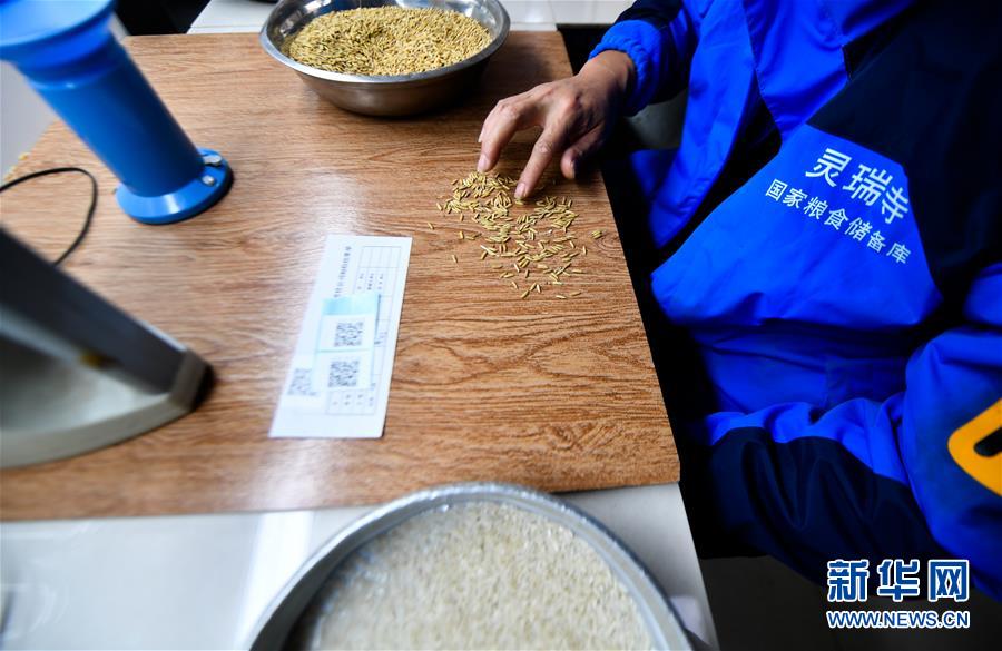 10月16日,灵瑞寺国家粮食储备库新库区的工作人员对农户送来的粮食进行品质检测。 当日是“世界粮食日”,湖南省衡阳市衡阳县灵瑞寺国家粮食储备库新库区的工作人员冒雨为衡阳县及周边县乡农民收粮,在严格检测的基础上,将优质稻谷存入库区。衡阳县是湖南粮食主产县,常年粮食播种面积在150万亩以上,总产量在60万吨以上。 新华社记者 赵众志 摄