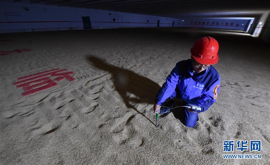 10月16日,灵瑞寺国家粮食储备库新库区的工作人员对已入库粮食进行日常抽检。 当日是“世界粮食日”,湖南省衡阳市衡阳县灵瑞寺国家粮食储备库新库区的工作人员冒雨为衡阳县及周边县乡农民收粮,在严格检测的基础上,将优质稻谷存入库区。衡阳县是湖南粮食主产县,常年粮食播种面积在150万亩以上,总产量在60万吨以上。 新华社记者 赵众志 摄