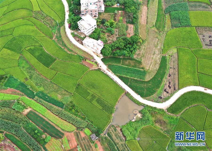 这是广西南宁市邕宁区蒲庙镇美丽的田园风光(10月16日摄,无人机照片)。 近日,广西南宁市邕宁区蒲庙镇的晚稻开始抽穗灌浆,纵横交错的田地郁郁葱葱,宛如色彩丰富的调色板。 新华社记者 周华 摄