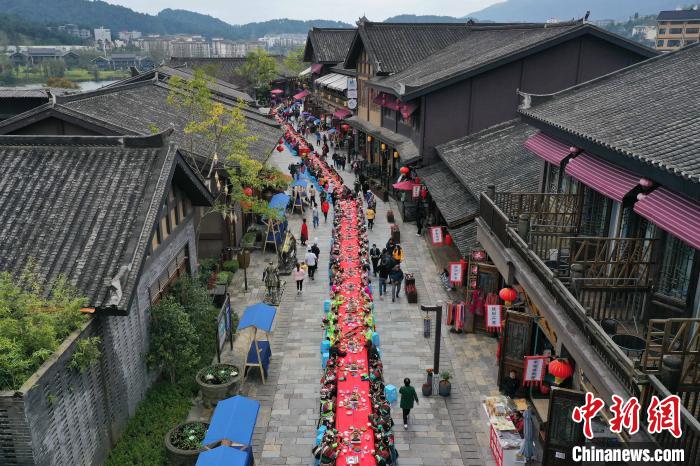 航拍吃新节长桌宴,民众品尝佳肴。 黄晓海 摄