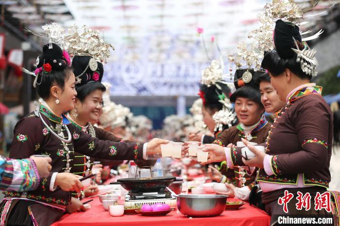 10月18日,贵州省黔东南苗族侗族自治州丹寨县万达小镇在“中国丹寨非遗周”中举办苗族吃新节体验活动,苗族同胞与游客现场体验苗族传统吃新节民俗,共同品尝苗族长桌宴,在欢声笑语中乐享金秋。