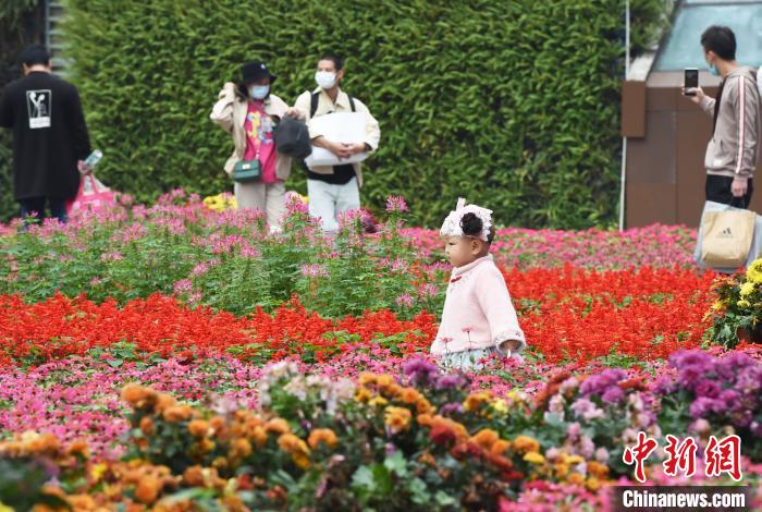 图为市民在艳丽的鲜花丛中漫步。 周毅 摄