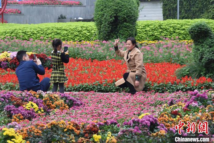 图为五颜六色的鲜花盛开吸引市民拍照留念。 周毅 摄