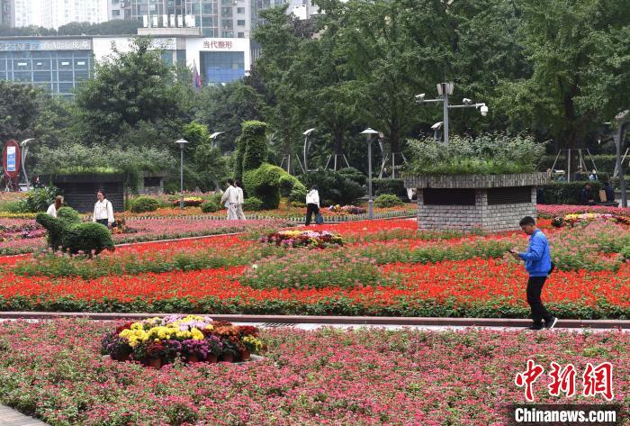 图为重庆观音桥街心公园的鲜花竞相绽放,吸引市民眼球。 周毅 摄