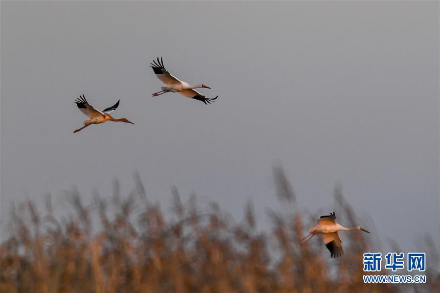 10月19日,在位于吉林省白城市镇赉县的莫莫格国家级自然保护区,几只白鹤从湿地上空飞过。 近日,在吉林省白城市镇赉县,近千只白鹤来到莫莫格国家级自然保护区停歇。白鹤部分种群繁殖于西伯利亚地区,在中国鄱阳湖越冬,莫莫格湿地是它们每年秋季南迁的重要停歇地。 新华社记者 张楠 摄