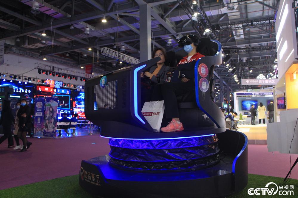 参展者正坐在动感座椅上观看VR影片。