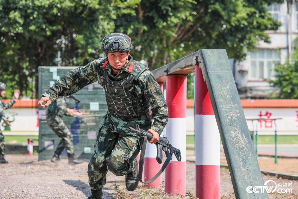 图为武警官兵快速通过障碍独木桥。(周子越 果志远 摄影报道)