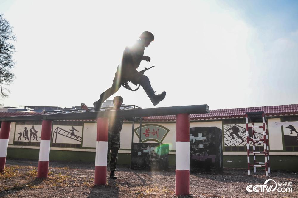 图为武警官兵快速通过障碍独木桥。(周子越 果志远 摄影报道)
