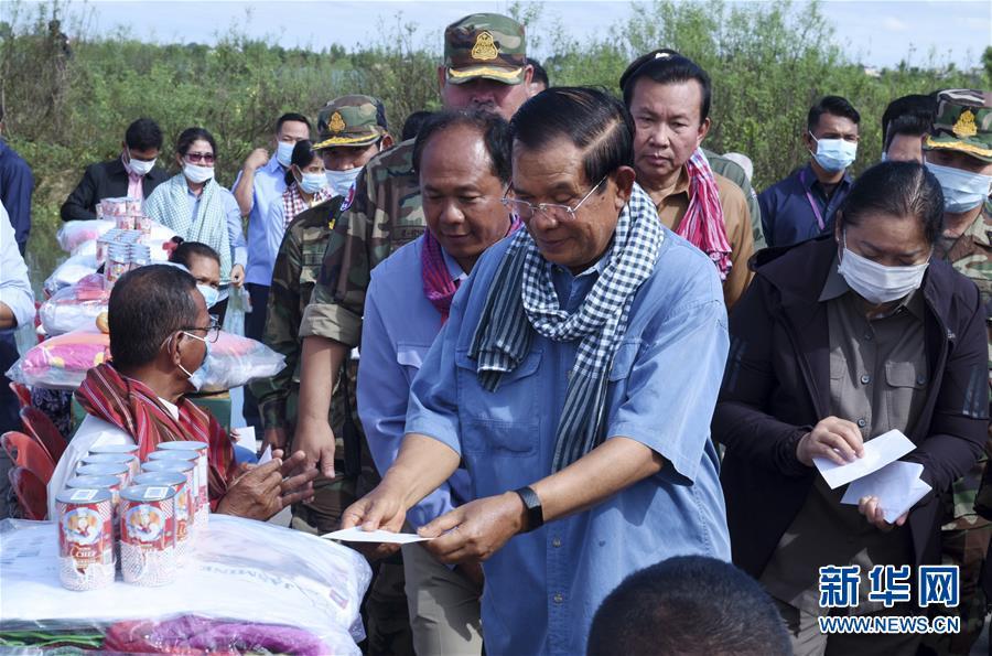 10月21日,在柬埔寨班迭棉吉省,柬埔寨首相洪森(中)向受灾群众发放慰问品。 柬埔寨首相洪森21日在柬西北部班迭棉吉省表示,近期洪灾已导致柬34人丧生。柬埔寨国家灾难管理委员会19日说,雨季暴雨加上热带风暴带来的洪灾已影响到柬19个省和直辖市,逾31万人受灾,超过7.3万栋房屋、29万公顷农田被淹,政府已出动军队等开展抗洪救灾、帮助民众撤离,已有3.7万余人被疏散。 新华社发(李莱 摄)