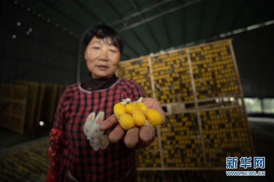 10月21日,溪东村蚕农展示收获的“黄金茧”。 近日,浙江开化县溪东村村企合作的“黄金茧”迎来丰收。溪东村是传统的蚕桑专业村,受困于养蚕利润逐年降低,当地蚕桑业曾面临萎缩的困境。2018年,在开化县相关部门牵线搭桥下,溪东村与知名丝绸企业合作,引进浙江大学科研团队培育的“黄金茧”特种蚕种,集中力量开展规模化集约化特种原料茧示范基地建设。结对帮扶企业以保护价进行收购,效益较普通白茧提高30%以上,预计2020年产量达4.5万斤,可为当地农民增收近百万元。 新华社发