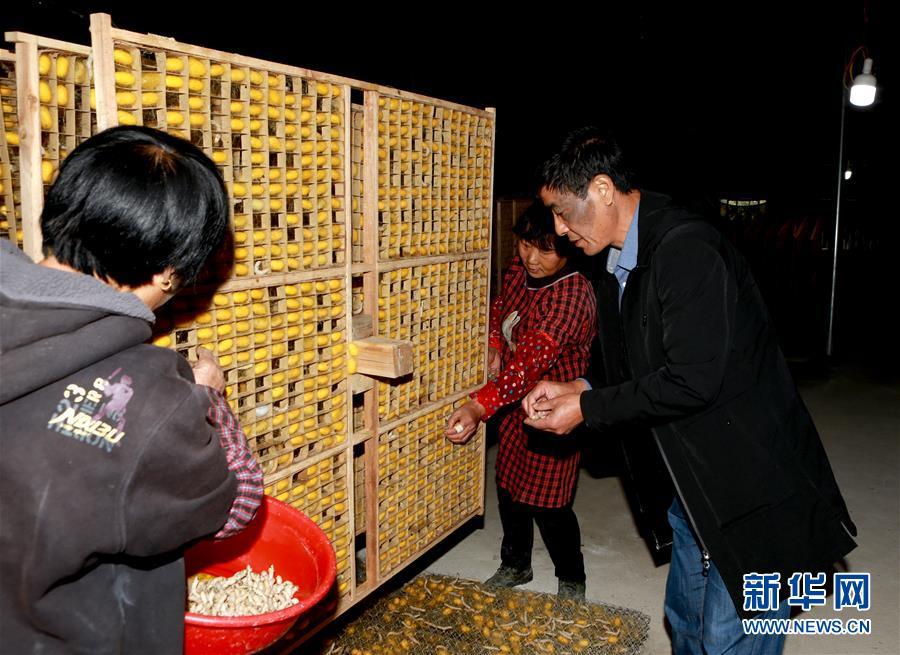10月21日,万事利丝绸开化桑蚕基地技术专家余根龙(右一)向溪东村蚕农介绍“黄金蚕”结茧的注意事项。 近日,浙江开化县溪东村村企合作的“黄金茧”迎来丰收。溪东村是传统的蚕桑专业村,受困于养蚕利润逐年降低,当地蚕桑业曾面临萎缩的困境。2018年,在开化县相关部门牵线搭桥下,溪东村与知名丝绸企业合作,引进浙江大学科研团队培育的“黄金茧”特种蚕种,集中力量开展规模化集约化特种原料茧示范基地建设。结对帮扶企业以保护价进行收购,效益较普通白茧提高30%以上,预计2020年产量达4.5万斤,可为当地农民增收近百万元。 新华社发