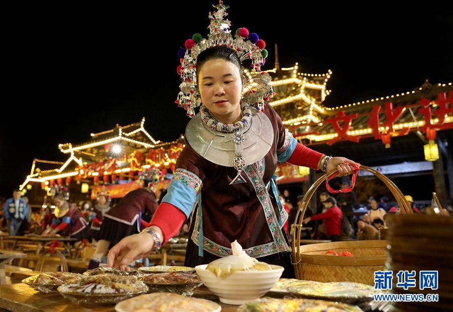 10月22日,在广西柳州市三江侗族自治县林溪镇冠小屯,侗族村民在摆百家宴。 当日,来自广东的一个千人旅游团走进广西柳州市三江侗族自治县,通过观楼桥、赏歌舞、品侗族百家宴等丰富形式,体验侗乡缤纷多彩的民俗风情。 近年来,三江县充分发挥民族特色文旅游资源,依托便捷交通条件,加大旅游引客力度,让特色民族风情游带动餐饮、住宿、农产品加工等相关产业快速发展,助力群众脱贫致富。 新华社发(龚普康 摄)
