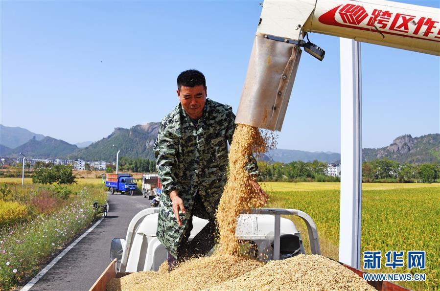 10月23日,在浙江省台州市仙居县双庙乡公平村,农民在收获晚稻。 眼下,江苏、浙江等地种植的晚稻进入收割期,当地农民及时抢收,确保颗粒归仓。 新华社发(王华斌 摄)