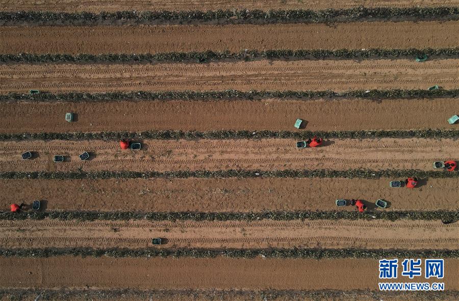 10月26日,昌黎县一家葡萄酒生产企业的工人在葡萄种植基地采收酿酒葡萄(无人机照片)。 进入10月以来,河北省昌黎县5万多亩酿酒葡萄进入收获季节,葡萄酒企业对酿酒葡萄进行采收、分拣、榨汁,迎来葡萄酒酿造生产旺季。据介绍,昌黎县拥有葡萄酿酒企业27家,形成了集酿酒葡萄种植、葡萄酒酿造、旅游观光、休闲康养等为一体的葡萄酒产业集群。目前该县的葡萄酒产业全产业链年销售收入达36亿元。 新华社记者杨世尧摄