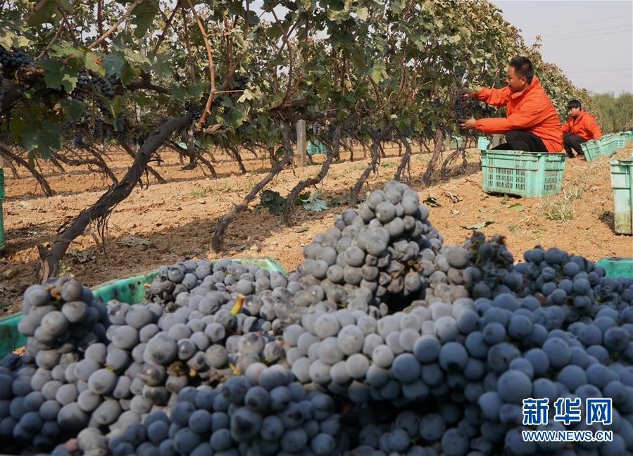 10月26日,昌黎县一家葡萄酒生产企业的工人在葡萄种植基地采收酿酒葡萄。 进入10月以来,河北省昌黎县5万多亩酿酒葡萄进入收获季节,葡萄酒企业对酿酒葡萄进行采收、分拣、榨汁,迎来葡萄酒酿造生产旺季。据介绍,昌黎县拥有葡萄酿酒企业27家,形成了集酿酒葡萄种植、葡萄酒酿造、旅游观光、休闲康养等为一体的葡萄酒产业集群。目前该县的葡萄酒产业全产业链年销售收入达36亿元。 新华社记者杨世尧摄