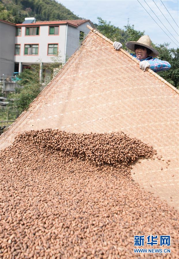 10月26日,诸暨市东白湖镇里四村榧农在晾晒香榧。 金秋时节,浙江诸暨特色农产品香榧获得丰收。目前,诸暨香榧种植面积13.7万亩,产果面积5万亩,今年产量3000吨,产值约10亿元。 新华社记者沙达提摄