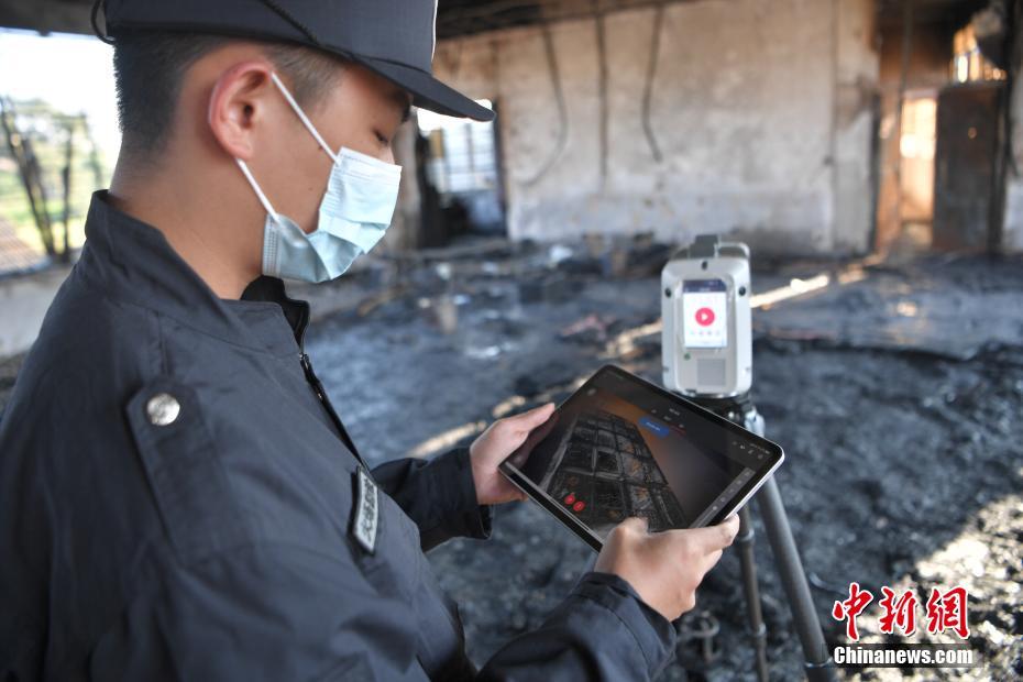 图为10月27日,火灾调查员利用激光测量仪建立火场三维立体模型。中新社记者 刘冉阳 摄