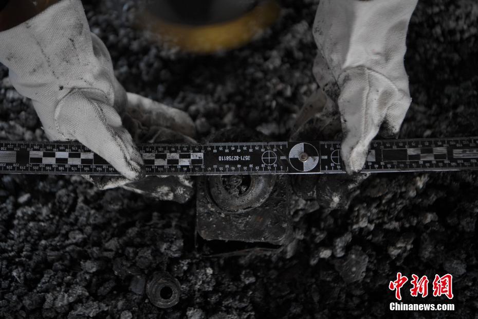 图为10月27日,火灾调查员在现场测量物证。中新社记者 刘冉阳 摄