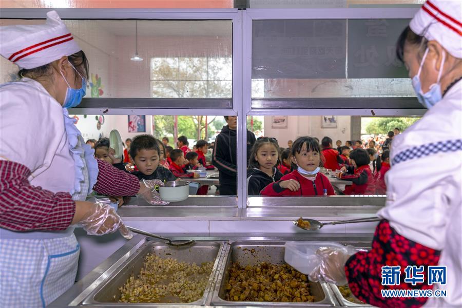 10月28日,贵州省毕节市黔西县锦星镇第一小学食堂工作人员在为学生打饭。新华社发(范晖 摄)