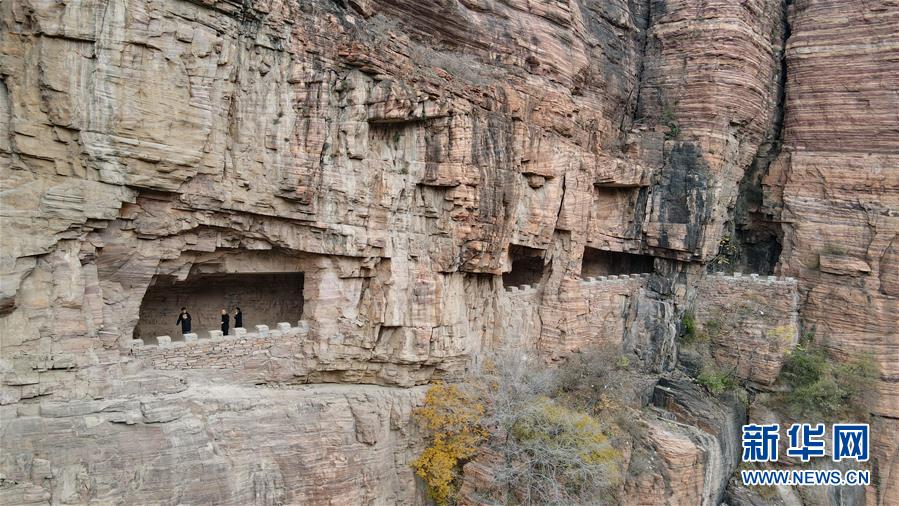 10月28日,游客在峡沟村“挂壁公路”游览(无人机照片)。 河北省沙河市柴关乡峡沟村“挂壁公路”修筑于太行山深处峡沟水库北侧崖壁上,是当地群众20世纪70年代为解决“行路难”、完全依靠人工开凿而成。“挂壁公路”全长560米,高于水面数十米,路洞顺山势蜿蜒,内高3米,宽约6米,公路每隔几米就留有透光“天窗”,用于采光、通风、观景。如今,峡沟水库和“挂壁公路”已成为当地发展全域旅游的重要载体。 新华社记者 牟宇 摄
