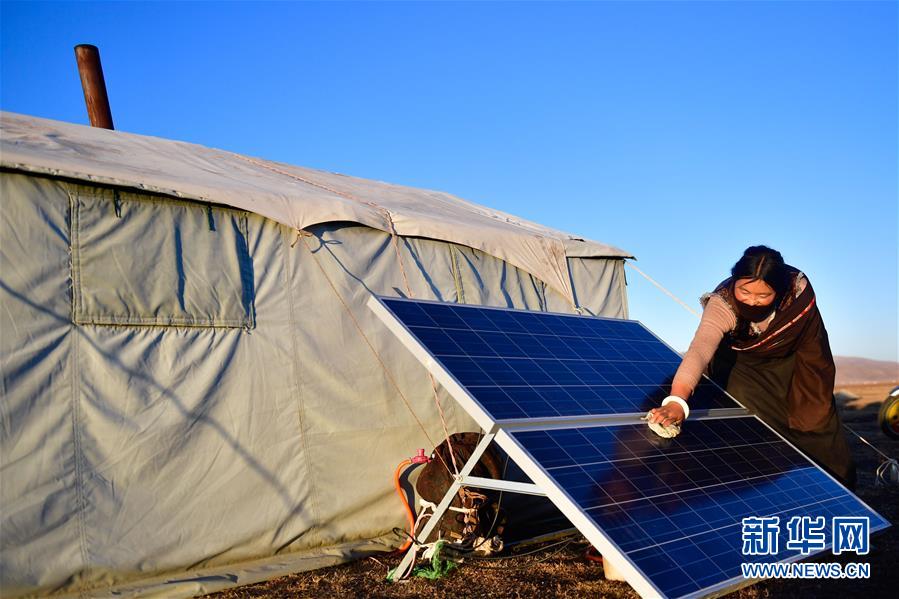 10月28日,青海省玉树藏族自治州称多县珍秦镇二村牧民扎西德藏在擦拭太阳能电板。 日前,位于青海省玉树藏族自治州称多县的嘉塘草原生机勃勃。嘉塘草原地处三江源生态保护区的核心区,畜牧业是当地赖以生存和发展的支柱产业。近年来,当地政府通过调整产业结构,构建划区轮牧、科学养畜、草畜平衡、协调发展为主的生态畜牧业,形成生态保护和畜牧业生产的良性循环。 新华社记者 张龙 摄