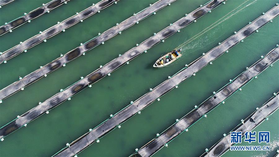 10月28日,工人在山东省荣成市天海湾海洋牧场捕捞海参(无人机照片)。 目前正是秋海参捕捞时节,山东省荣成市的海参养殖企业和养殖户们每天都忙着捕捞海参供应各地市场。近年来,荣成市海参养殖迅猛发展,已成为当地渔业增效、渔民增收的支柱产业之一。 新华社发(王福东 摄)