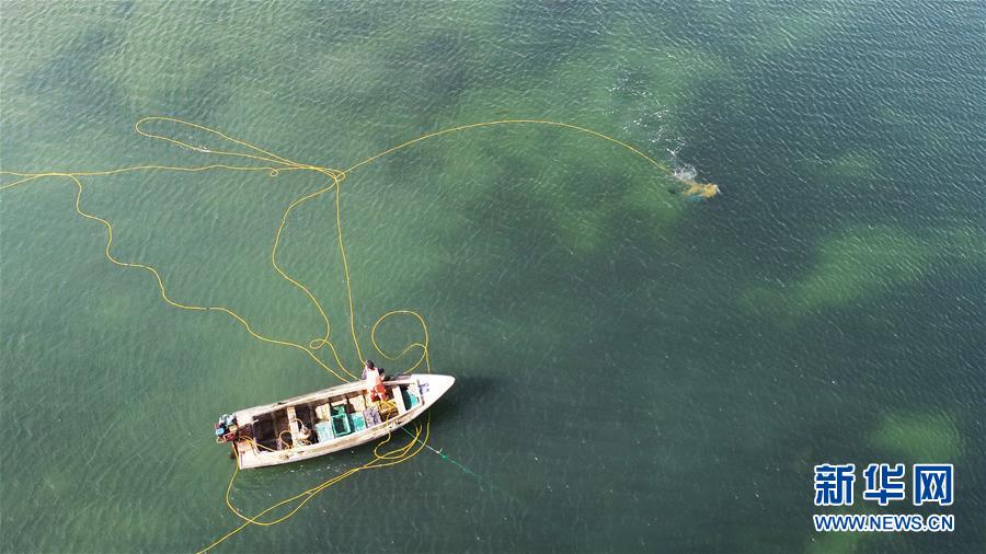10月28日,工人在山东省荣成市天海湾海洋牧场捕捞海参(无人机照片)。 目前正是秋海参捕捞时节,山东省荣成市的海参养殖企业和养殖户们每天都忙着捕捞海参供应各地市场。近年来,荣成市海参养殖迅猛发展,已成为当地渔业增效、渔民增收的支柱产业之一。 新华社发(王福东 摄)